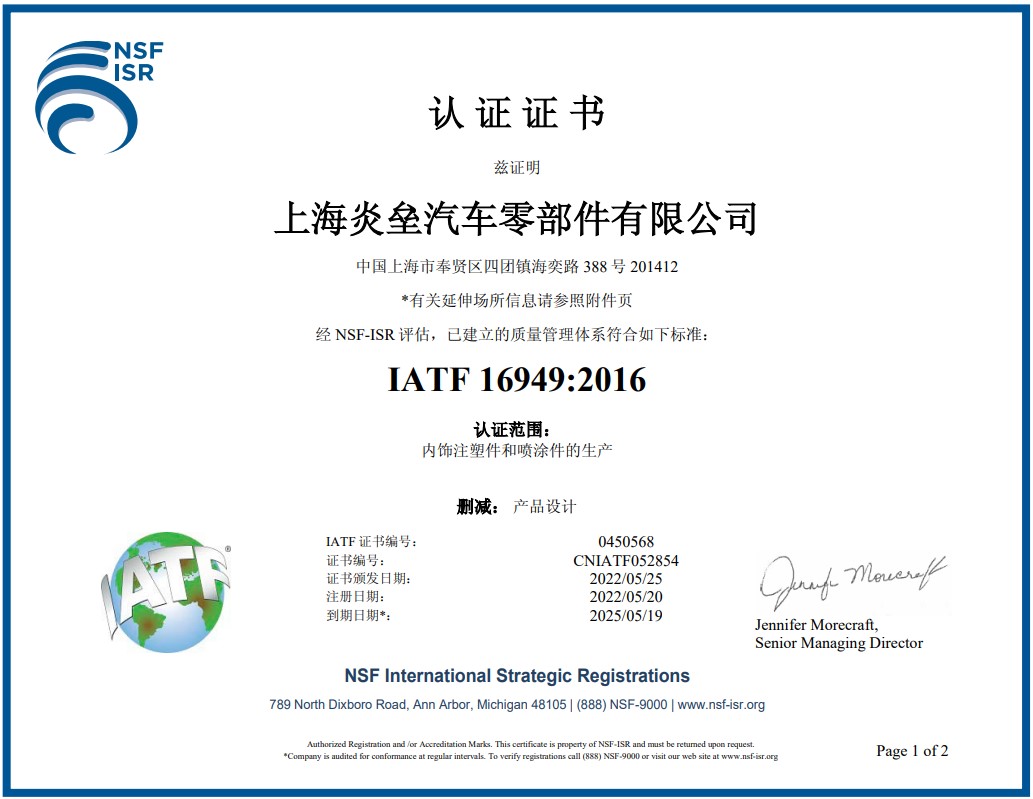 2019年5月份獲得了ITAF/TS 16949質(zhì)量管理體系認(rèn)證證書。